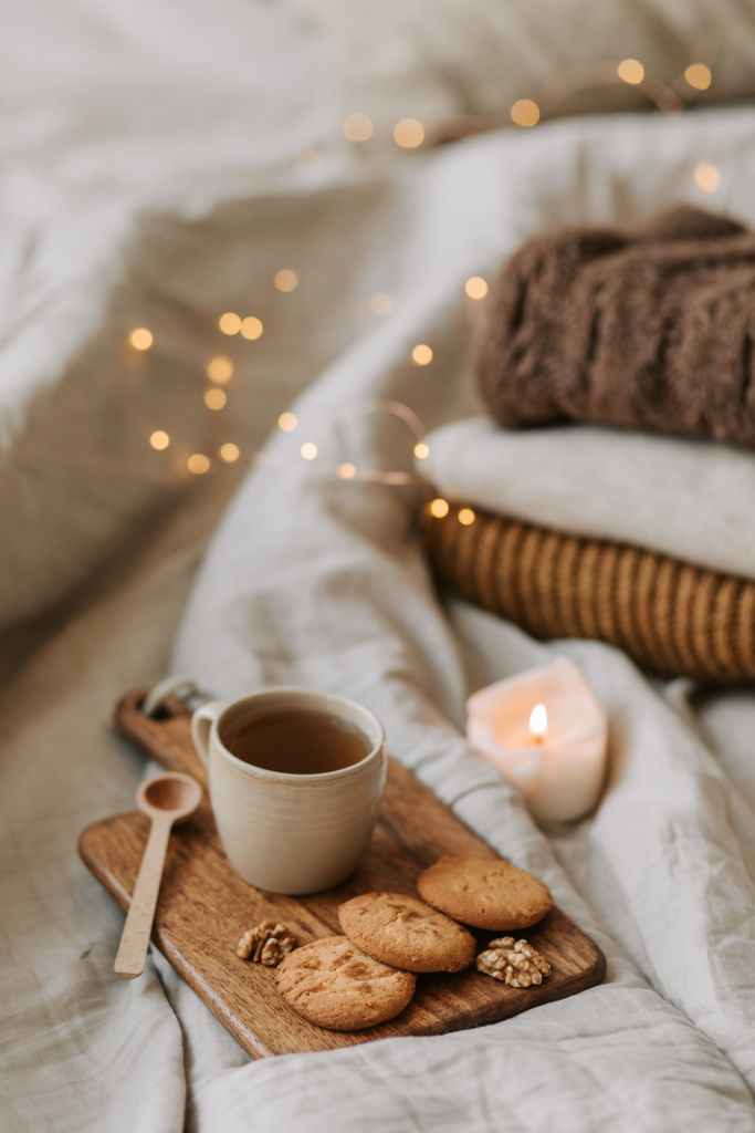 Enjoying a warm drink Is an excellent way to get yourself feeling cozy from the inside out. Prepare your favorite warm beverage such as a cup of tea, coffee, or even warm apple cider and serve it in your favorite mug. Then sit back and enjoy.