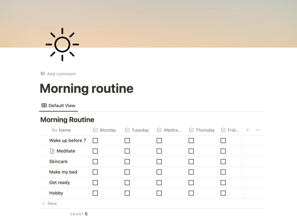 I am continuing to work on implementing routines that set me up for success. While giving myself grace in the process. I’m using Notion to keep track of my morning and evening routines. Having this guide is helpful for remaining consistent.