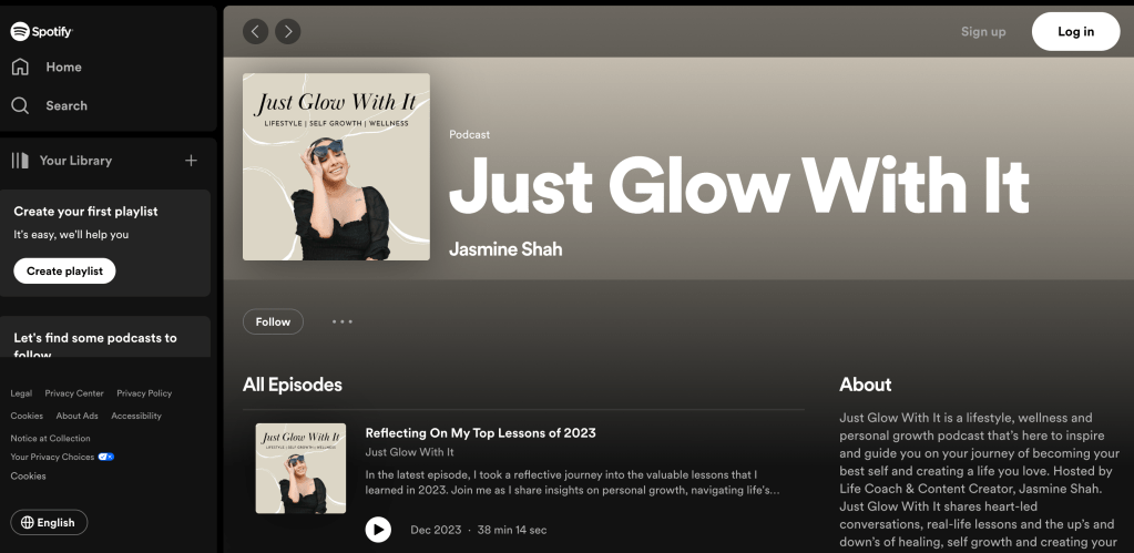 Jasmine Shah (Just Glow With It host) talks all about lifestyle, wellness, and personal growth. Her content is so motivating and truly makes me want to do the work to improve myself.