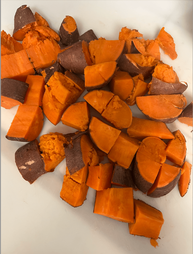 Rinse the sweet potatoes, use a fork to poke holes in them, and cook them for 5 minutes in the microwave. You may have to adjust the time depending on the size of your sweet potatoes. You’ll know they are done when they feel slightly soft. Once the sweet potatoes are cooked, cut them up into cubes.