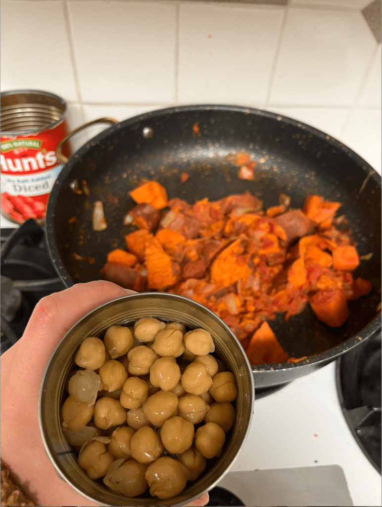 While the sweet potatoes cook, heat some oil in a large pan and saute the garlic and onion over medium heat until the onions are soft and transluscent. Add in the cubed sweet potatoes, canned tomatoes, and spices.